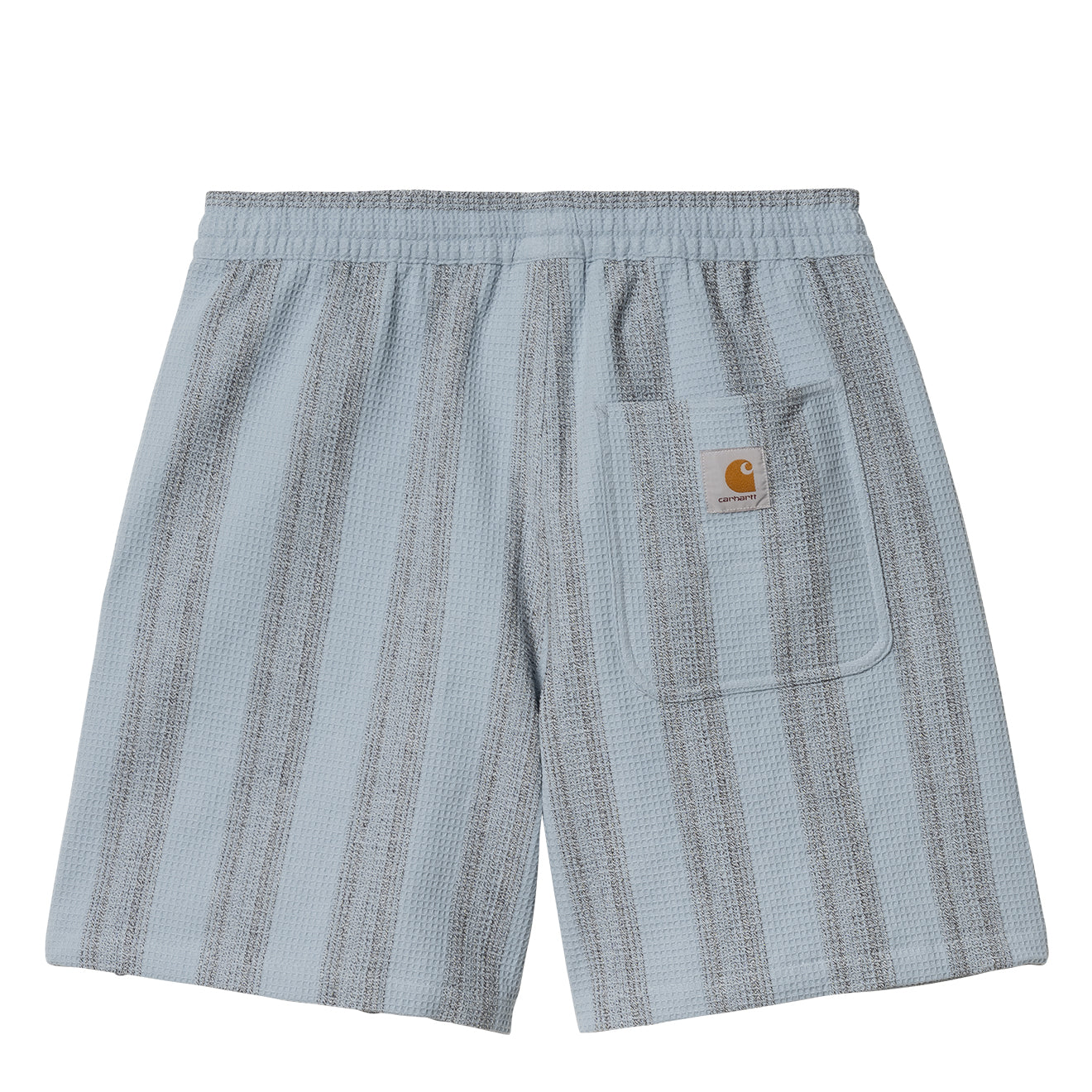 The Carhartt WIP Dodson Stripe Short in Misty Sky is made from midweight, textured cotton waffle, featuring allover stripes. The item has an elasticated drawstring waistband for an adjustable fit. A woven Square Label appears on the back pocket.