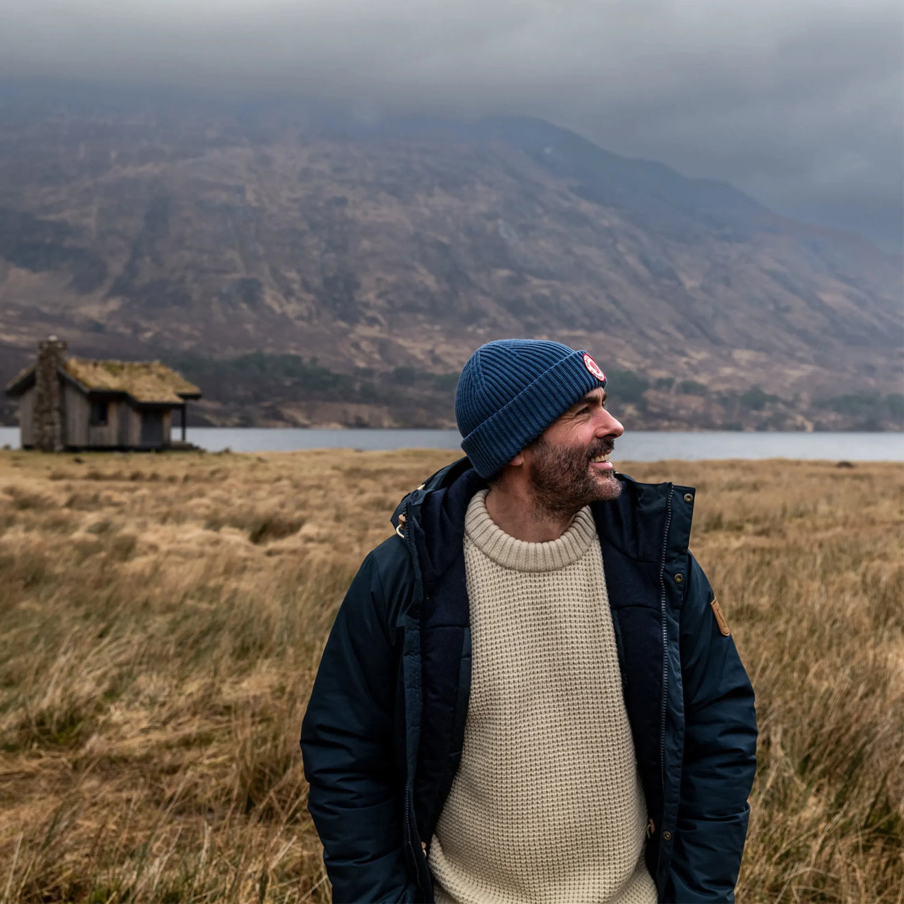 The Fjällräven 1960 Lite Logo Hat in Indigo Blue is a rib-knitted beanie made from a soft blend of traceable ZQ merino wool and organic cotton. Its shallow fit sits slightly higher on the head, making it ideal for shoulder-season wear. Featuring a wide folded edge and an embroidered Fjällräven emblem on the front, it combines classic style with functional warmth.