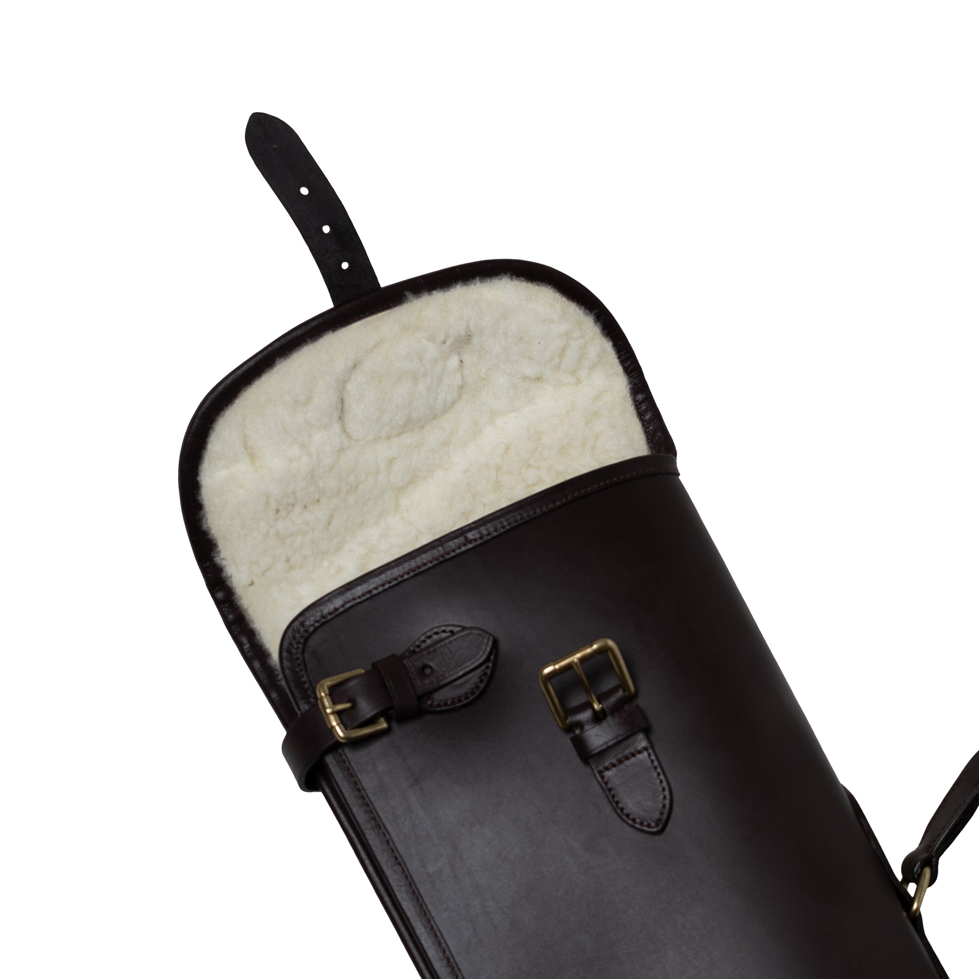 The GMK Stockbridge Leather Gun Slip in Brown is a traditionally styled shotgun slip designed to protect and carry shotguns with barrels up to 32 inches. Crafted from dark brown leather and lined with soft faux sheepskin, it combines durability with a classic finish, complete with brass fittings and a secure buckle closure.