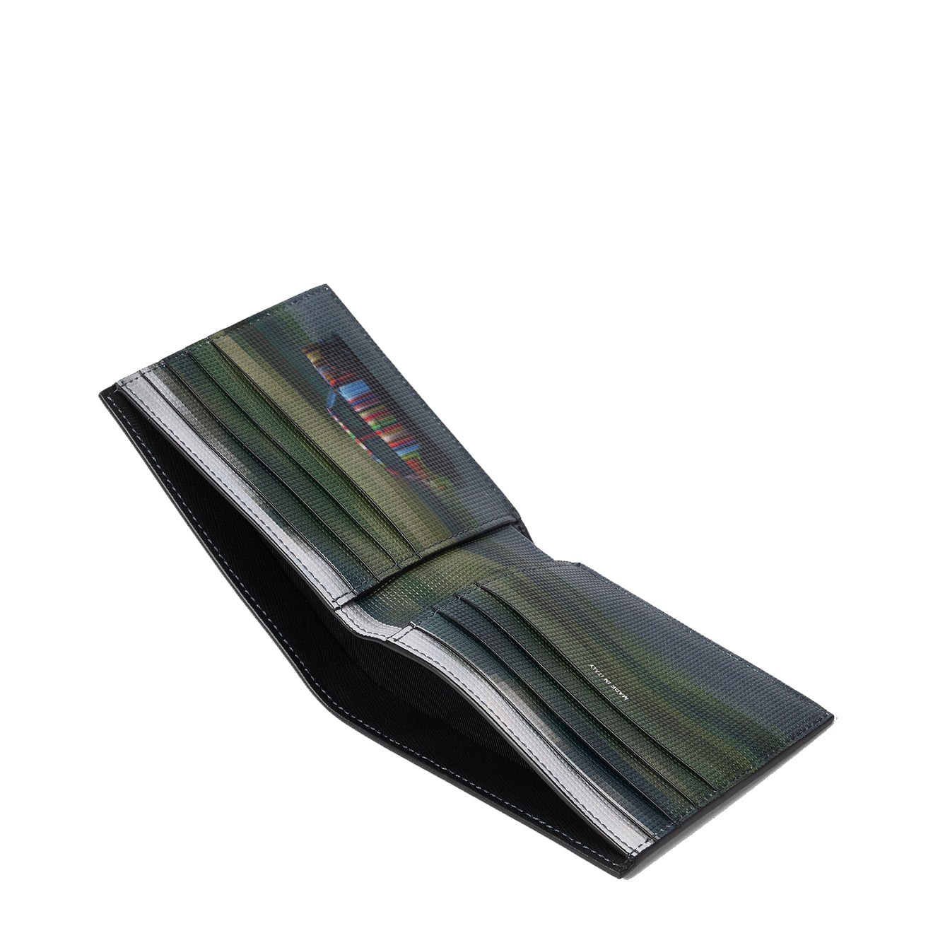 the Paul Smith Leather Pixelated Mini Interior Billfold Wallet in black combines a textured leather exterior with a vibrant pixelated interior for a subtle contrast in a classic billfold shape.