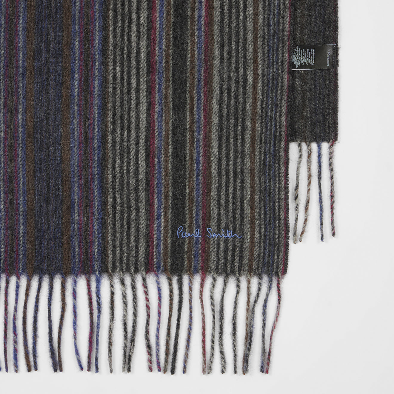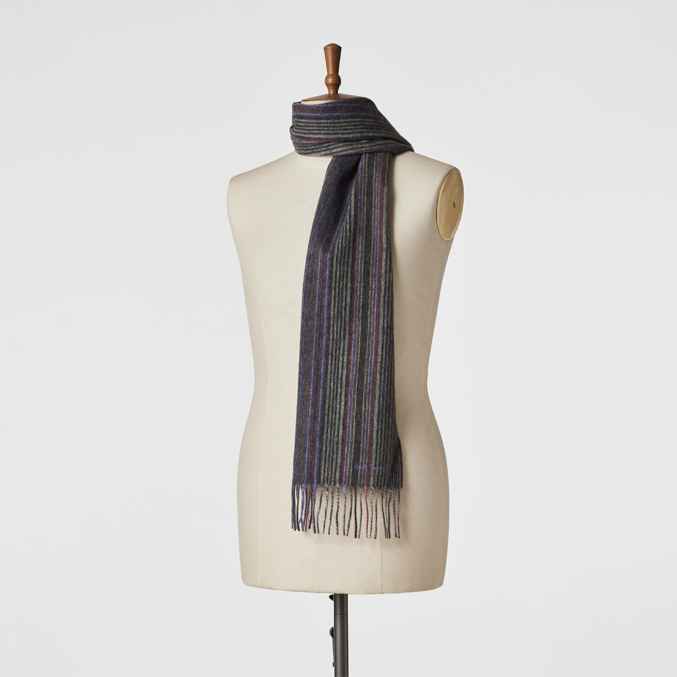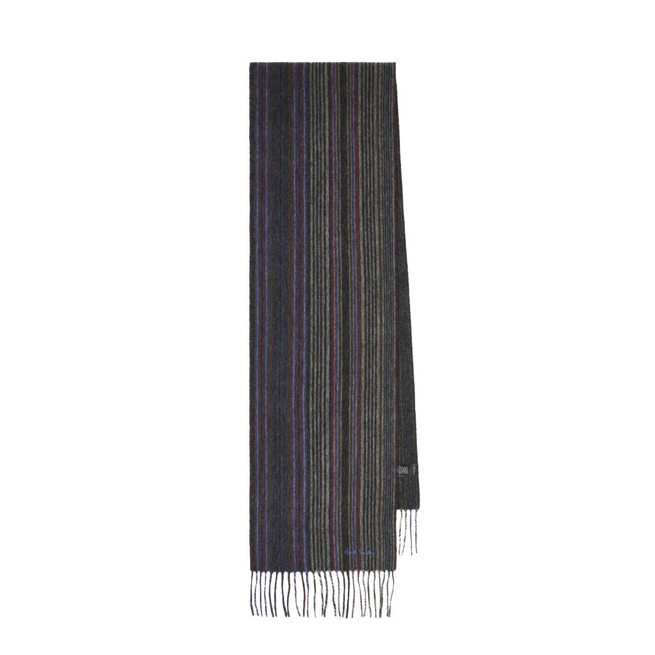 the Paul Smith Tonal Stripe Lambswool Scarf in grey is a soft lambswool design with gentle stripes and subtle embroidered detail for easy everyday wear.