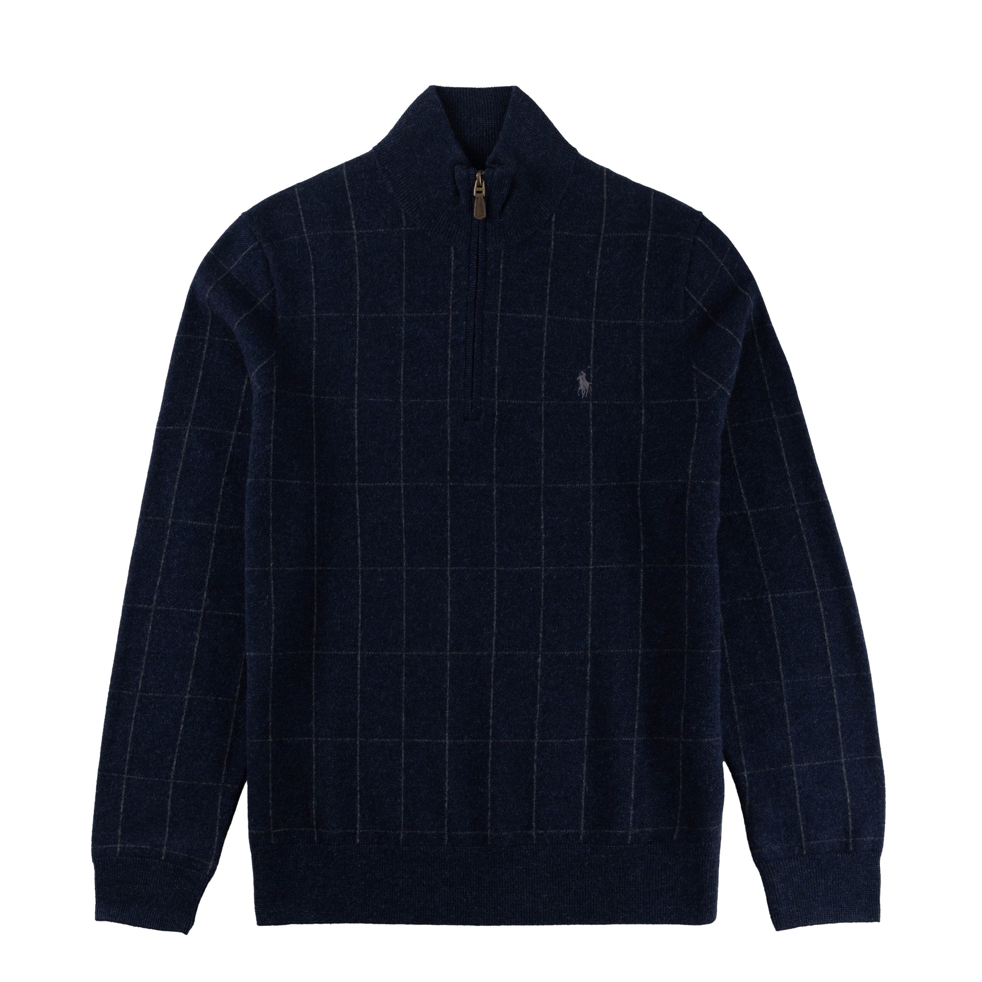 The Polo Ralph Lauren Quarter-Zip Sweater in Navy Combo is expertly knitted from premium wool, offering warmth and a soft, refined texture. Its classic check pattern provides a versatile style that bridges smart-casual and relaxed looks.