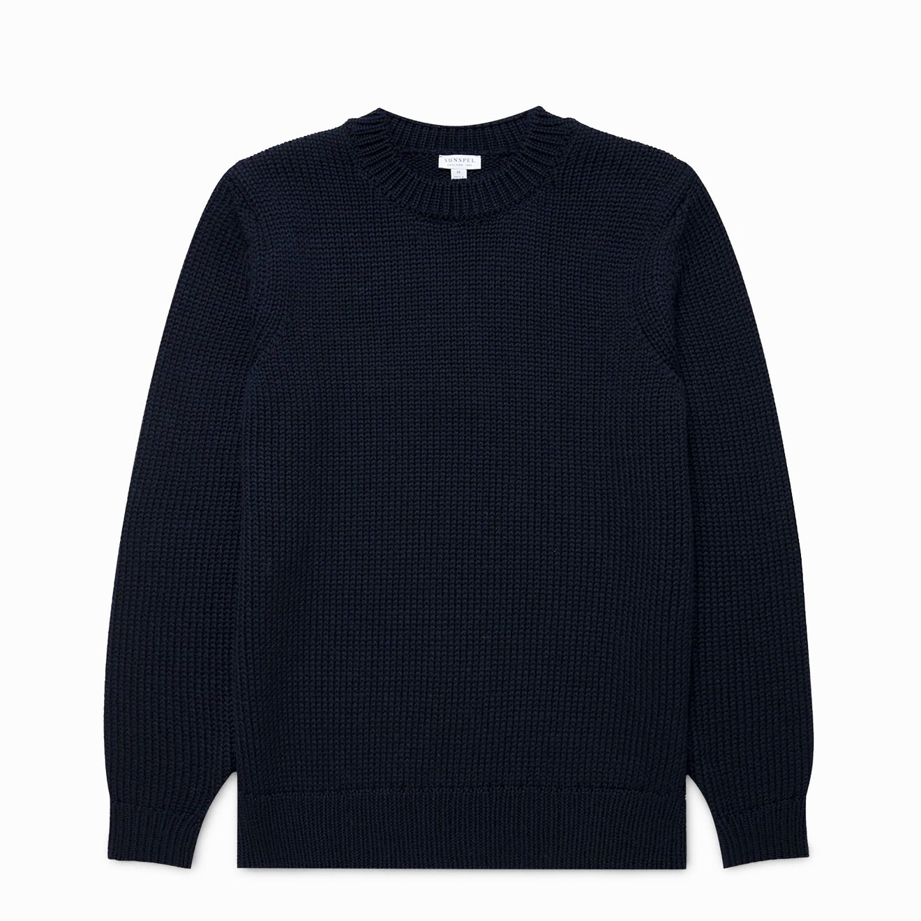 This Sunspel Fisherman Mock Neck jumper in Navy is inspired by traditional Guernsey knitwear. Crafted from soft merino wool that is both warm and breathable, this Sunspel jumper has a relaxed fit and ribbed trims that help it keep its shape.